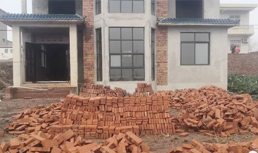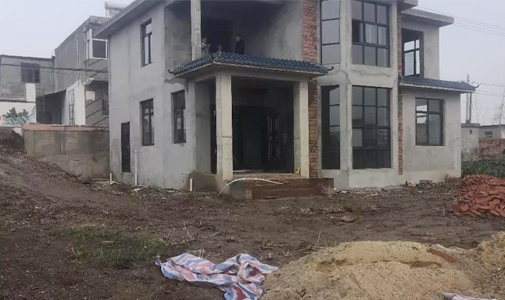 (按:此房屋地势为山丘,所以地面不平整,大门开向是经过阜阳景画园林风水顾问李银河现场用罗盘定向并结合男主人属相得出,最终庭院大门开在西北南北向。由此可以起到扩大庭院使用面积,起到收水纳财的作用。)
