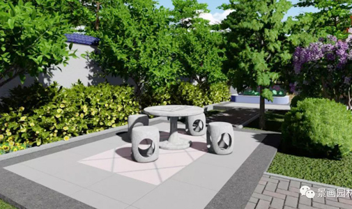 2、石凳 阜阳景画园林郑景龙设计石桌石凳一套,放置在院落偏东的位置,同时通往石凳石桌的地面进行硬质化